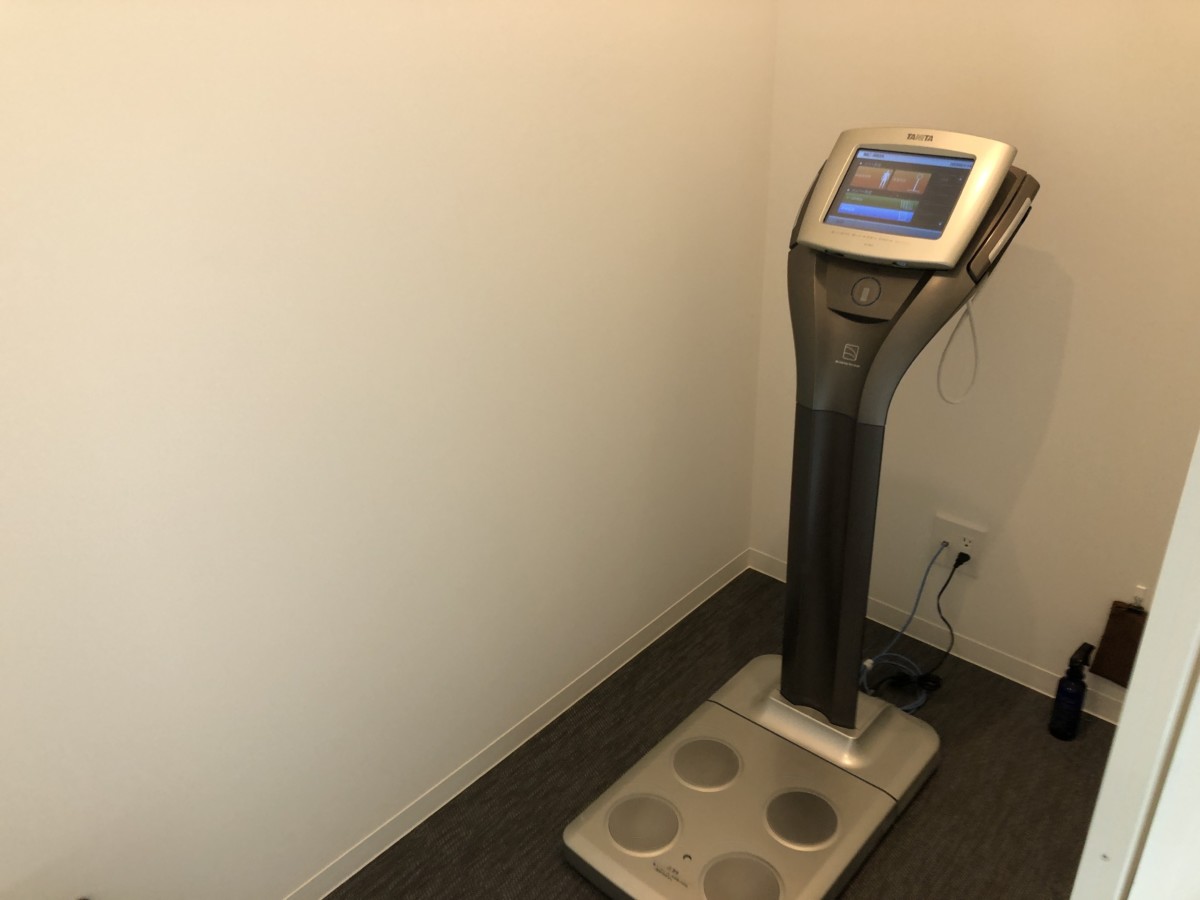 タニタの体組成計です。こちらは無料カウンセリング時に実際に計測することができます。体の隅々まで筋肉量や脂肪量を測定できる高級体組成計です。